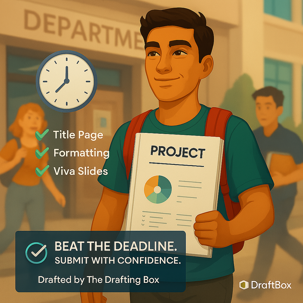 Our Major Project Reports, extending up to 60 pages, are meticulously crafted to meet academic standards across disciplines such as B.Tech, MBA, BBA, and BCA. Each report includes professionally formatted title pages, detailed charts, and thoroughly plagiarism-checked content, ensuring integrity and clarity. Designed to facilitate smooth submission and viva presentations, these reports provide a comprehensive, well-organized structure that supports your research findings effectively. Trust The Drafting Box to deliver a polished, academically rigorous project report that aligns with your institution’s requirements and enhances your evaluation experience.